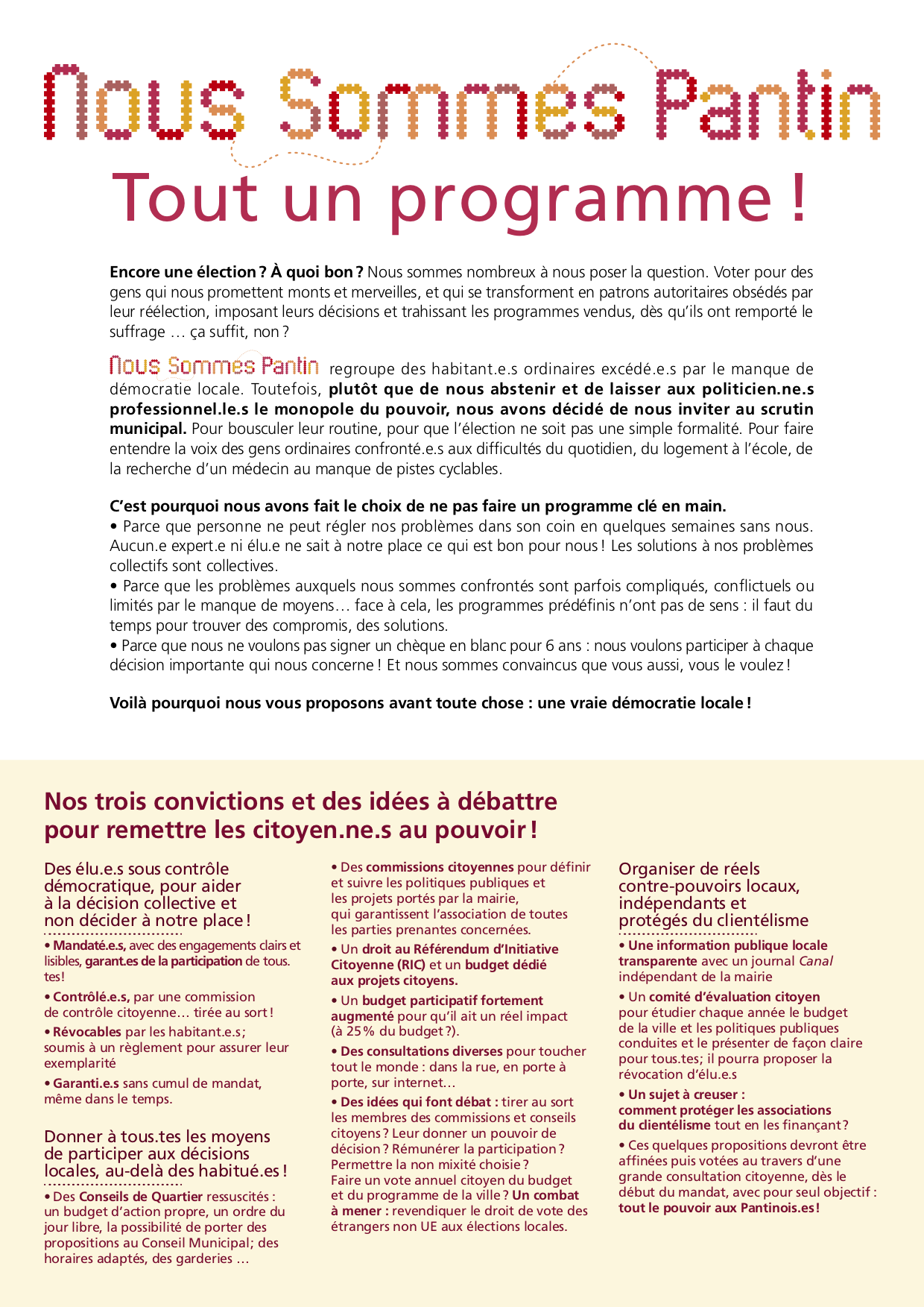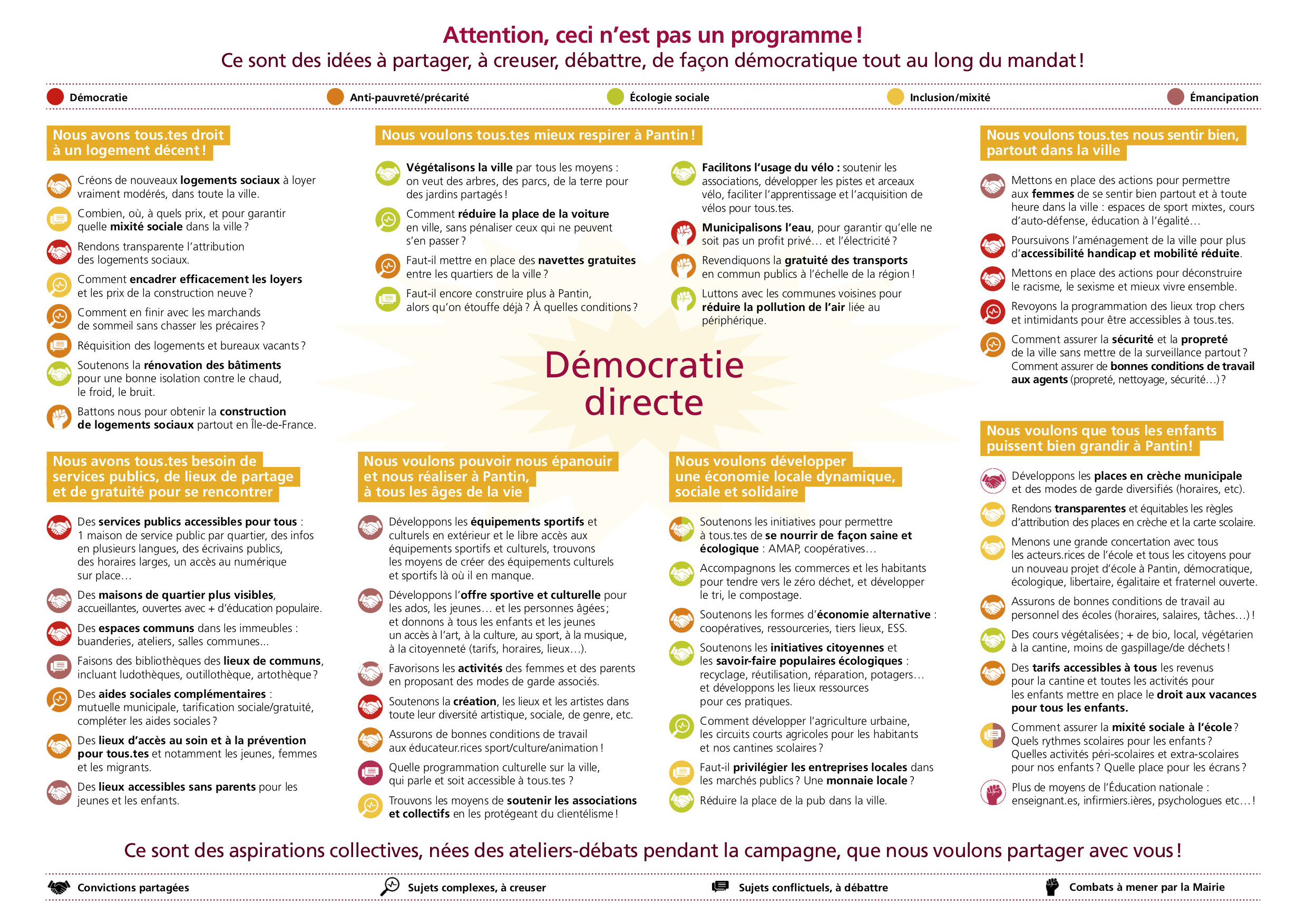 - Démocratie : Inspirations, orientations et propositions d’actions pour plus de démocratie à Pantin issues de nos travaux citoyens