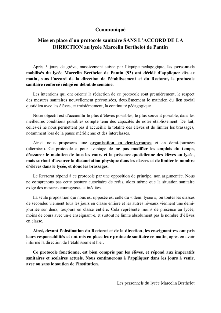 Décidés à soutenir une éducation publique, gratuite, de qualité, nous sommes solidaires de cette initiative d’auto-organisation des personnels du lycée Berthelot.